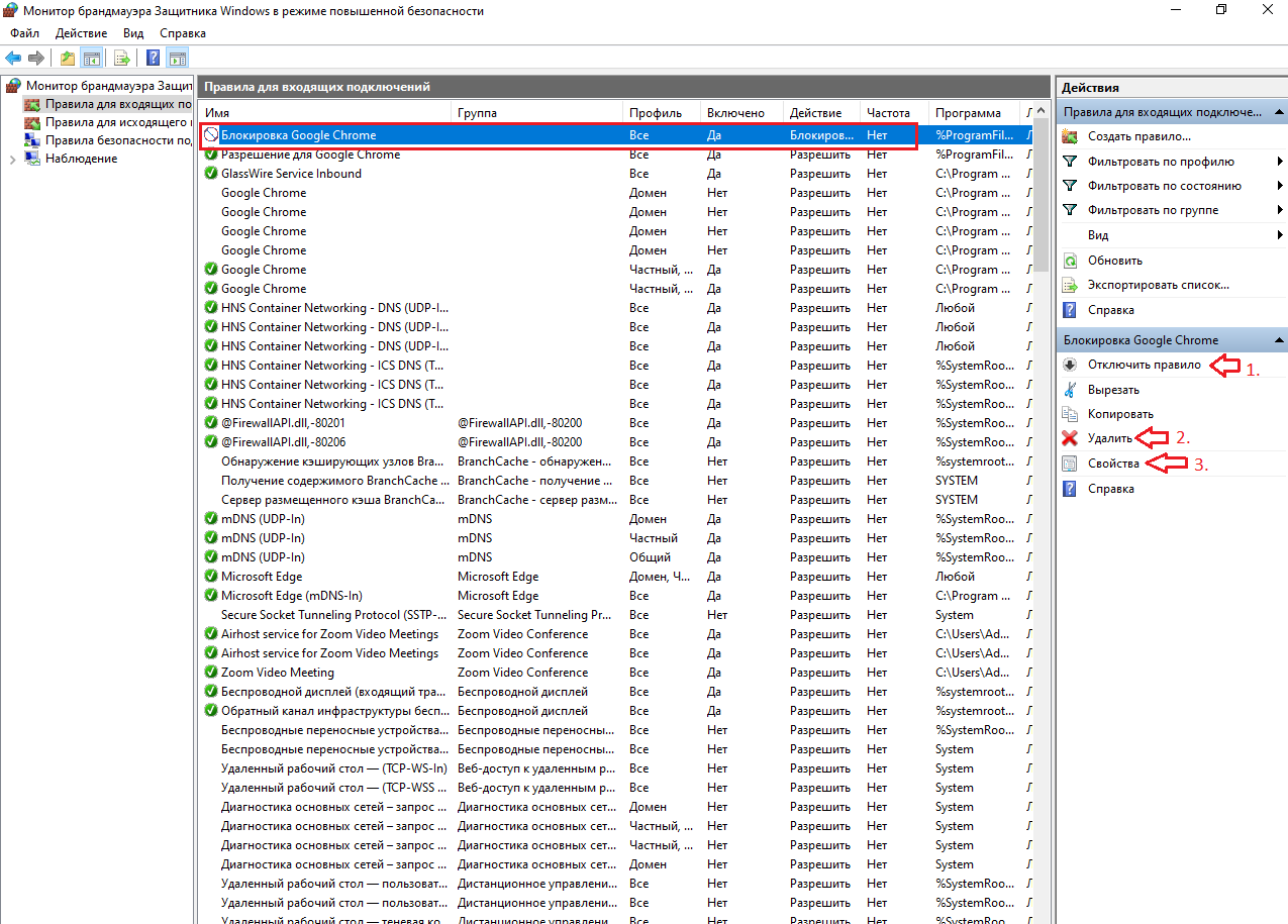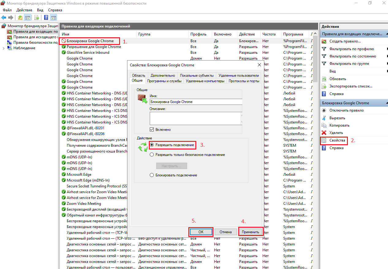 Например, выбрав правило (1.) и нажав Свойства (2.), вы можете на вкладке открывшегося окна «Общие», разрешить доступ в Сеть (3.), для выбранного правила. После, нажимаем «Применить» и «ОК».