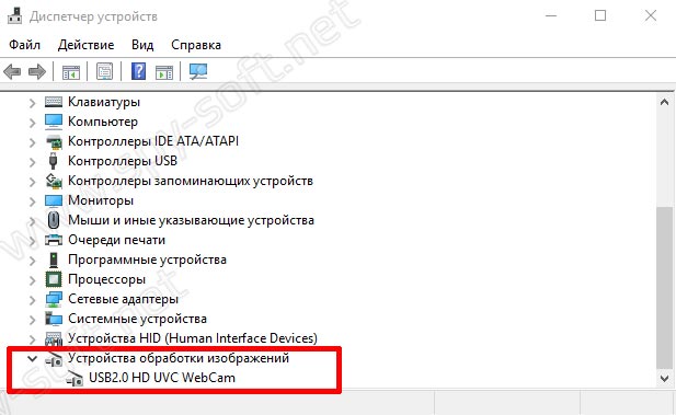 Теперь нам нужно найти то, как ваша камера называется компьютером. Запустите диспетчер устройств и найдите веб-камеру в списке:
