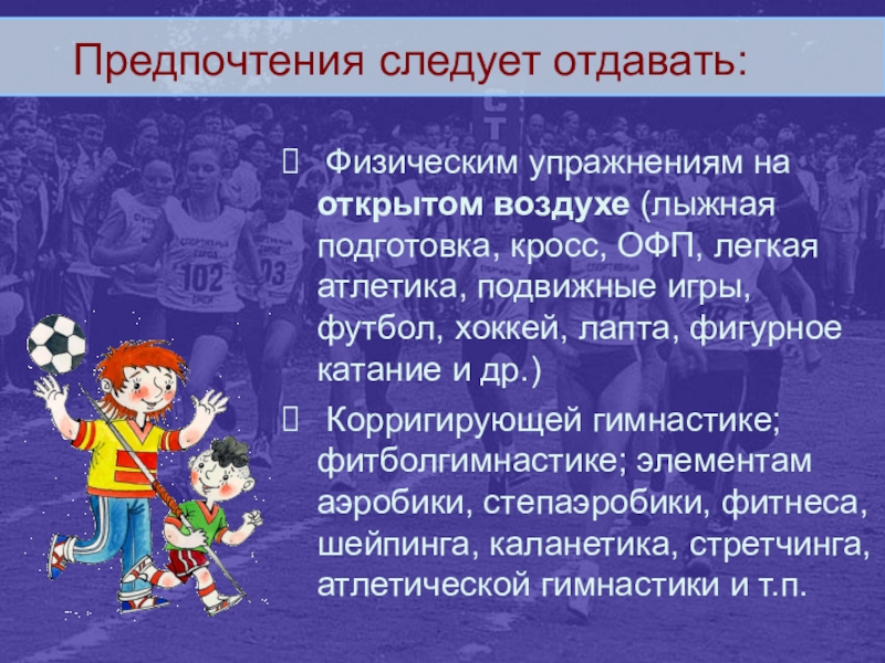ОФП, легкая атлетика, подвижные игры, футбол, хоккей, лапта, фигурное катание и др.)