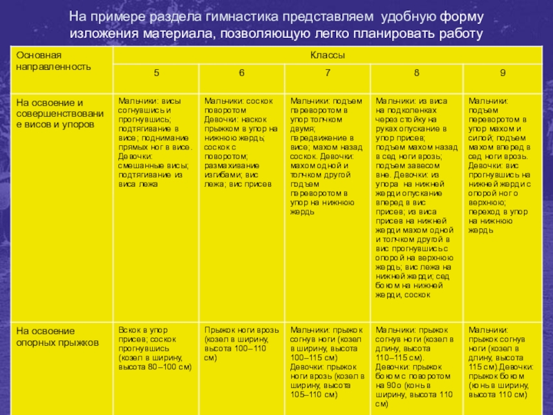 На примере раздела гимнастика представляем удобную форму изложения материала, позволяющую легко