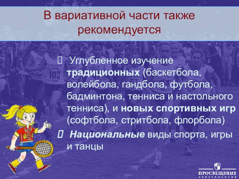 футбола, бадминтона, тенниса и настольного тенниса), и новых спортивных игр (софтбола, стритбола, флорбола)