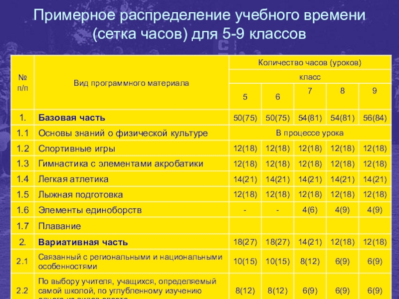 Примерное распределение учебного времени (сетка часов) для 5-9 классов