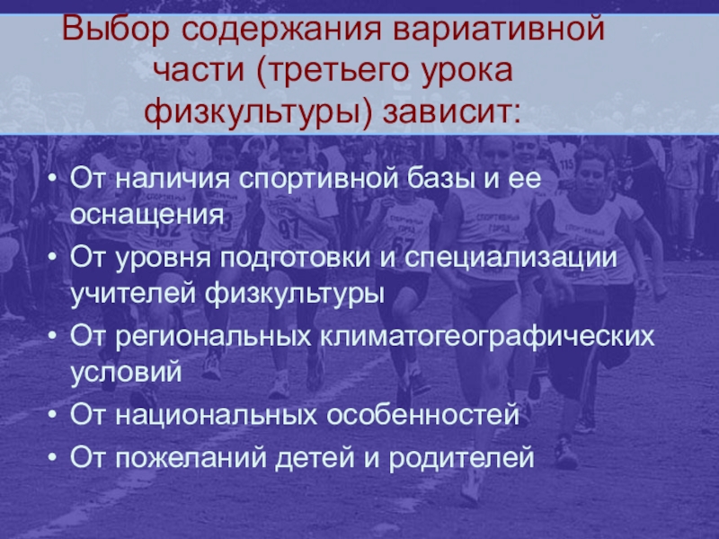 Выбор содержания вариативной части (третьего урока физкультуры) зависит: