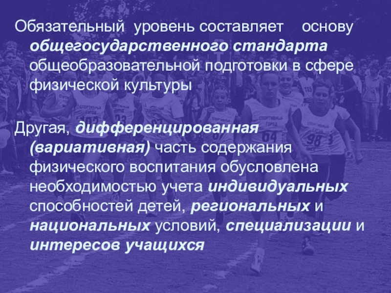 Другая, дифференцированная (вариативная) часть содержания физического воспитания обусловлена необходимостью учета индивидуальных способностей детей, региональных и национальных условий, специализации и интересов учащихся