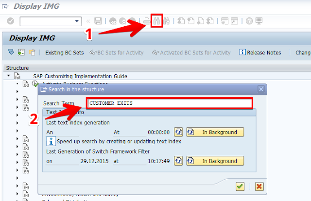 - После того, как вы нажмете на кнопку поиска, появится окно ‘Search in the structure’. Введите CUSTOMER EXITS в поле ‘Search Term’ и нажмите кнопку Enter.
