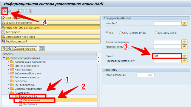 - Как только вы выполните описанные выше действия, на экране справа будет отображены BADI для выбранной вами транзакции/пакета.