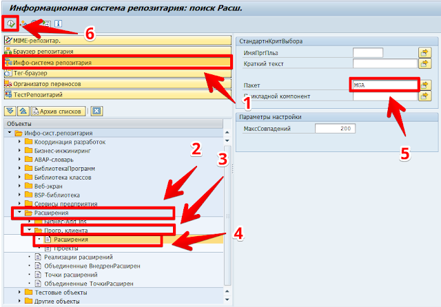 - После получения наименования пакета выполните транзакцию SE80 (вы также можете использовать транзакцию SE84) и кликните мышкой на ‘Инфо-система репозитария’.