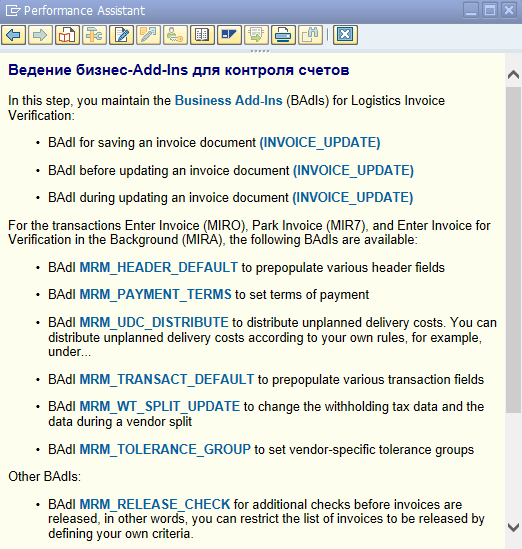 - Для того, чтобы получить список BADI для выбранной функциональности, нажмите кнопку ‘Документация к IMG-операции’ в строке ‘Ведение бизнес-Add-Ins для контроля счетов’ (Рис. 14).