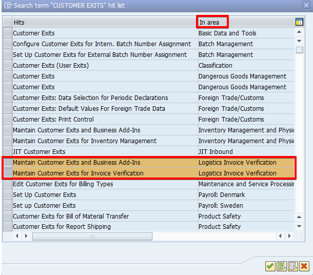 - Теперь вы можете нажать IMG Activity document для строки Maintain Customer Exits for Invoice Verification для того, чтобы посмотреть все соответствующие UE.