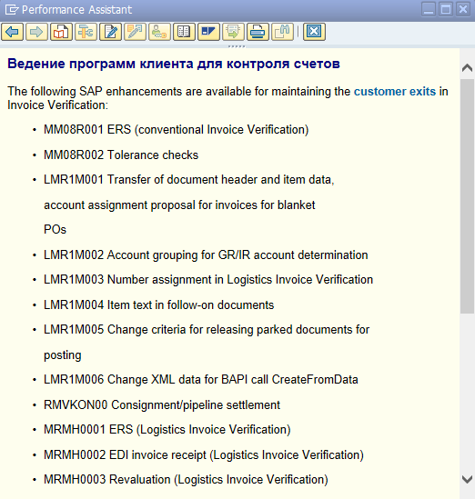 - Выполните транзакцию SPRO и пройдите по следующему пути в настройке ‘Управление материальными потоками’ -> ‘Контроль счетов логистики’ -> ‘Ведение программ клиента и бизнес-Add-Ins’. Нажмите кнопку ‘Документация к IMG-операции’ в строке ‘Ведение программ клиента для контроля счетов’, так вы получите список UE для данной функциональности (Рис. 13).