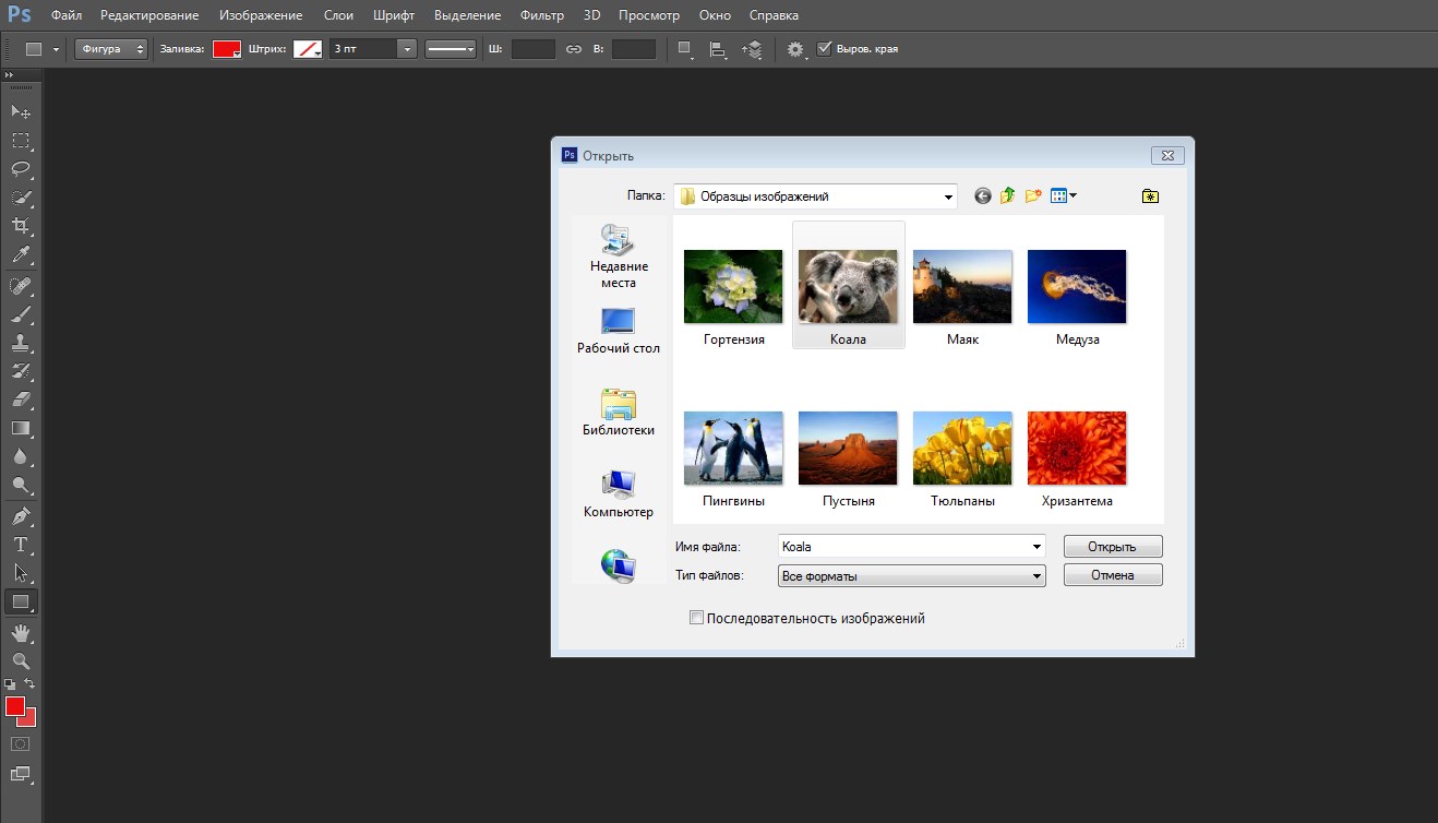 - Загрузить изображения. Для этого необходимо выполнить: Файл / открыть… и выбрать путь открытия файла.