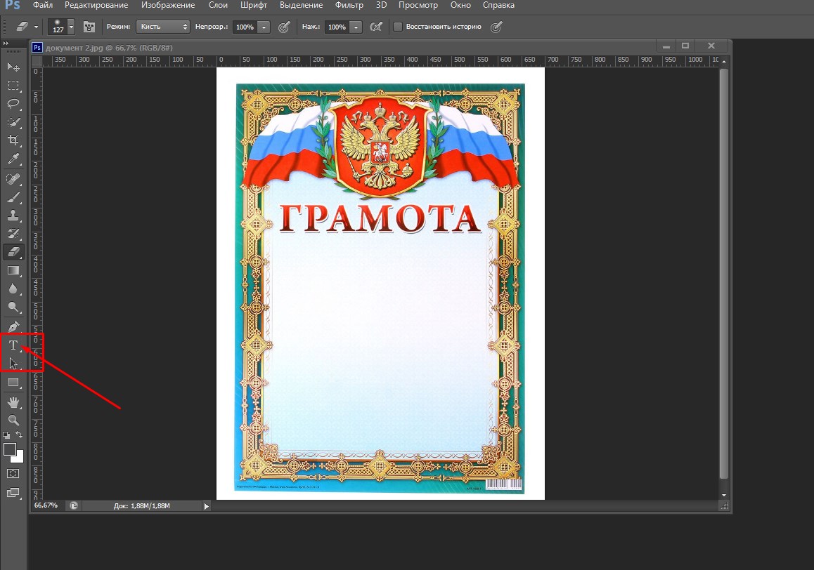 Выбираем на панели инструментов пиктограмму «Т», что обозначает текст.