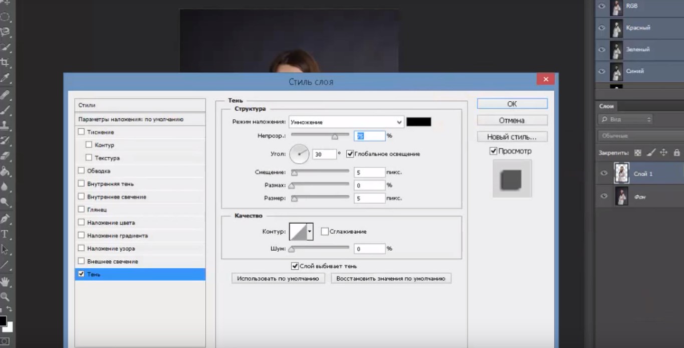 Нажимаем на дубликате слоя правой кнопкой мыши и выбираем параметр «Тень».