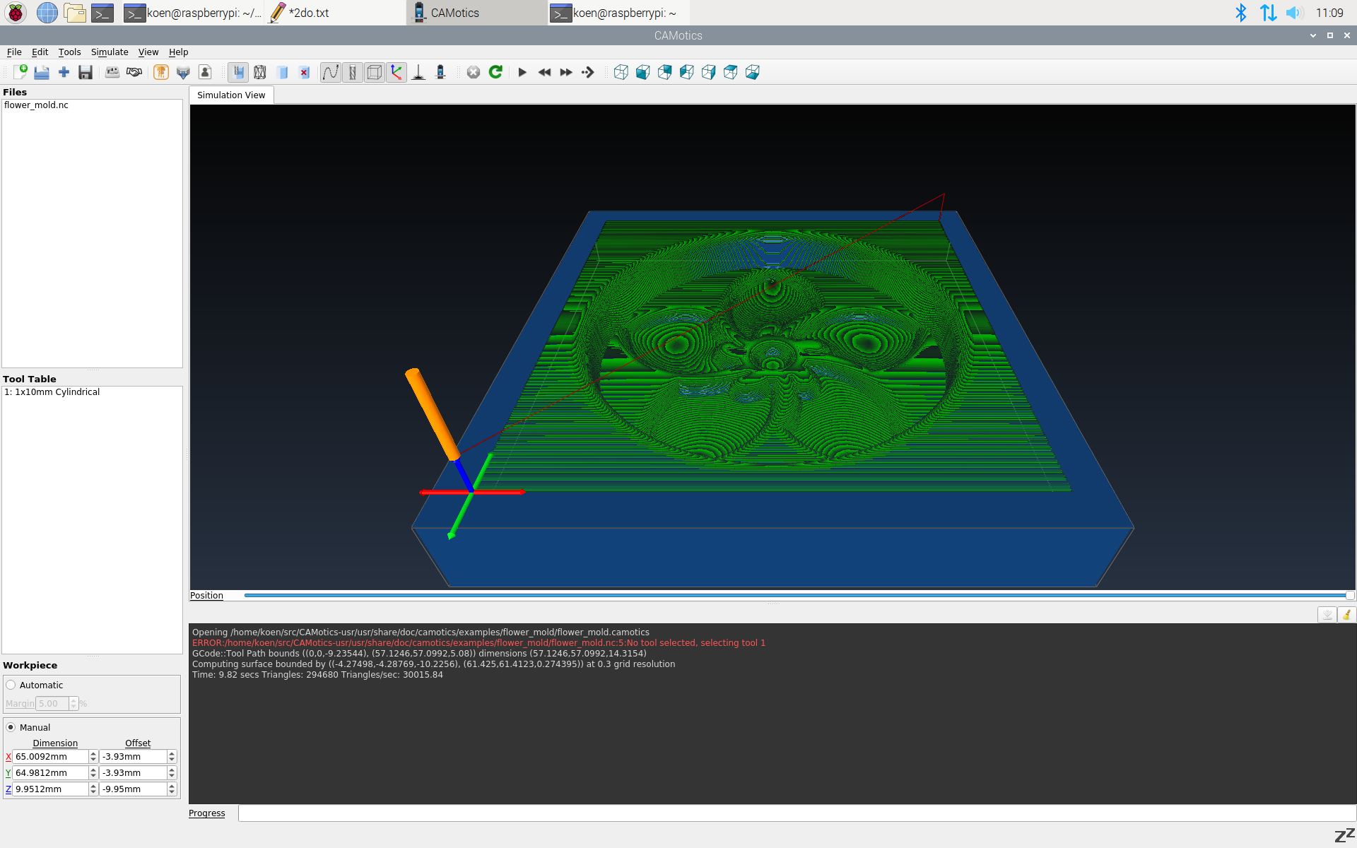 CAMotics может генерировать код для ЧПУ и моделировать его в 3D. Программа работает с различными формами инструментов, такими как цилиндрические и конические. Также можно вручную изменить G-код прямо внутри программы. Наконец, поскольку он имитирует результат в 3D, можно экспортировать 3D-модель в виде STL.