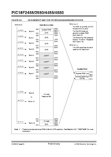 В расcматриваемых нами контроллерах память разделена. Программа записывается в отдельное пространство, именуемое памятью программы (PROGRAM MEMORY). Переменные и настройки хранятся в памяти данных (DATA MEMORY). Причем, ячейки памяти, выделенные для использования как переменные называются регистрами общего назначения (GENERAL PURPOSE REGISTERS или GPR) и настройки находятся в регистрах специального назначения (SPECIAL FUNCTIONS REGISTERS или SFR). Память данных поделена на 15 блоков и блоки меняются регистром BSR (BLOCK SELECT REGISTER).