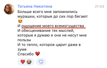 Вот только сегодня одна из таких участниц написала в личном чате: “А вечером мы с ней [начальницей — Л.Л] смотрели цифры за лето. Оказалось, что при напряженной обстановке с вирусом мы за полтора месяца лета заработали в два раза больше, чем у нее было тем летом, до моего прихода. Она была такая довольная. Я ей честно сказала, что это только начало :-)” В чужой стране)))