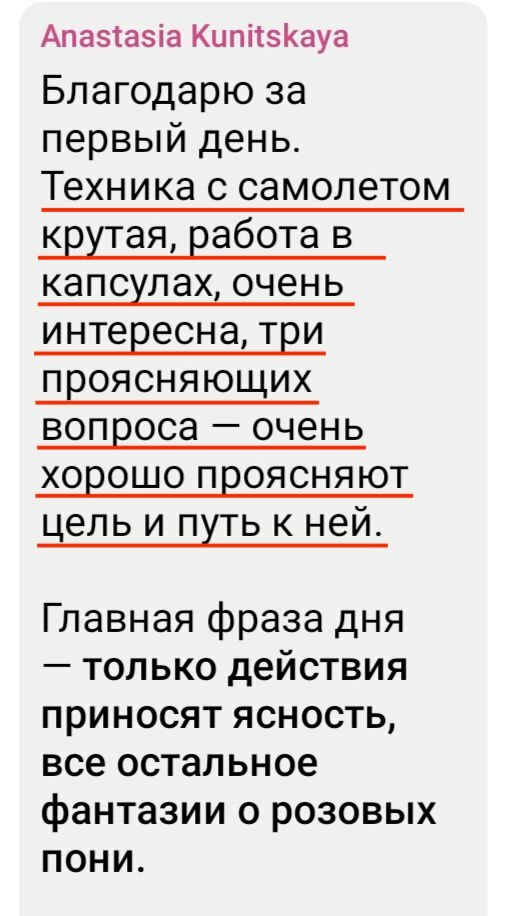 Не взлетели. Потому что алгоритмы предусматривали наработку определенных привычек, например, замечать особым образом свою ценность. Каждый день. Ну, и еще много чего, требующего накопительного эффекта. И этой наработки не было.