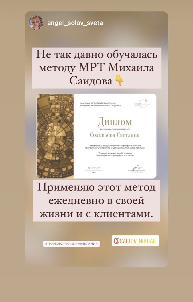 МРТ — это авторская методика Михаила Саидова, которая позволяет коучу в очень короткие сроки создавать для клиента один жизненный прорыв за другим.