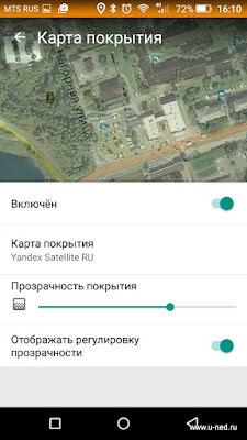 28. Также, на экране можно отображать сразу две карты посредством наложения их друг на друга — выбираем спутниковый снимок поверх локальных карт и ползунком в нижней части экрана выбираем степень его «прозрачности»