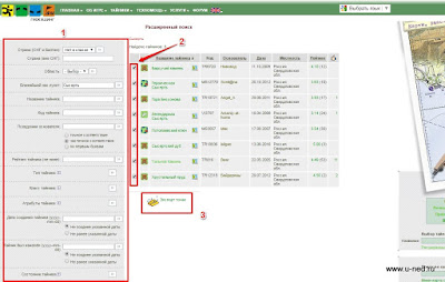 Вот, например возьмем подготовку к походу по тайникам Полевского. На сайте отбираем тайники, сохраняем файл: