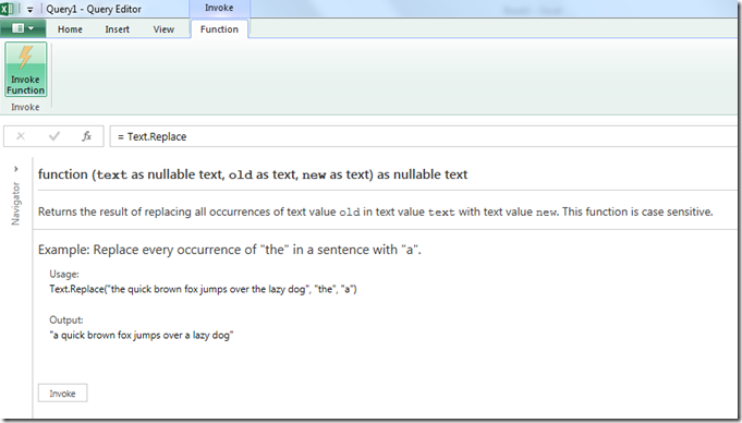 Возьмём, например, функцию Text.Replace(). Создадим пустой запрос и введем в строку формул следующее: