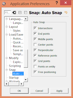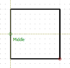 В QCAD версии 3 появилась долгожданная функция автоматической привязки. Теперь, нужная привязка автоматически активируется на некотором расстоянии от характерной точки. При таком «захвате» точки под курсором появляется подпись названия привязки (на рисунке ниже это Middle, то есть середина отрезка). При нажатии на кнопку мыши точка автоматически позиционируется по указанной привязке.