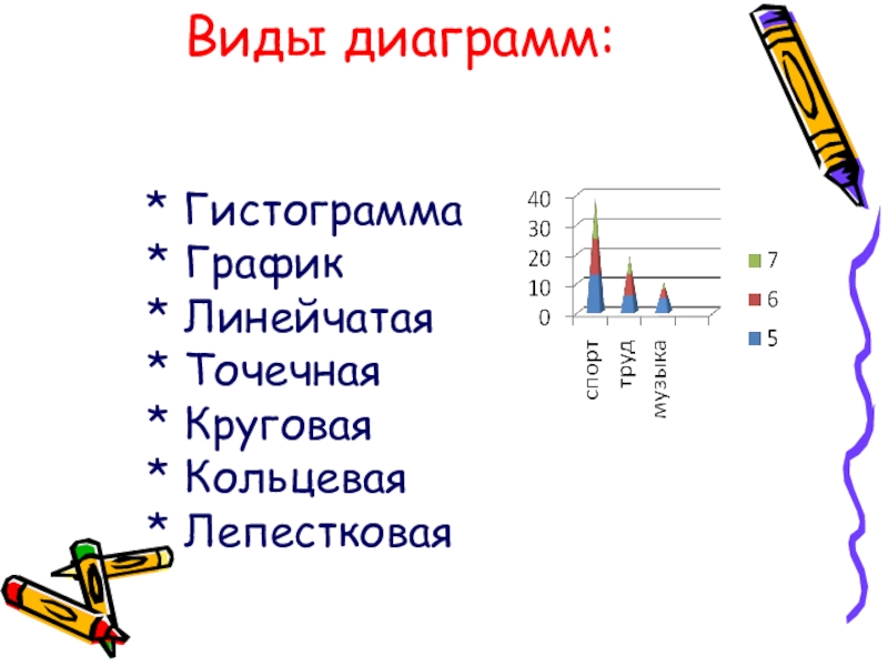 * Гистограмма * График * Линейчатая * Точечная * Круговая * Кольцевая * Лепестковая