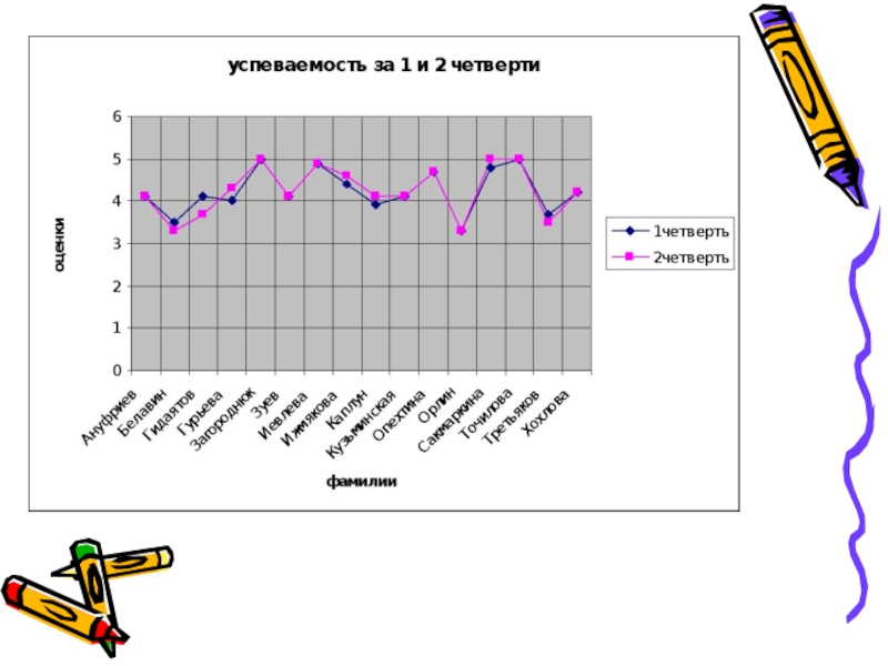 Слайд 14Успеваемость каждого учащегося легко отследить, используя столбчатую или линейчатую диаграммы.