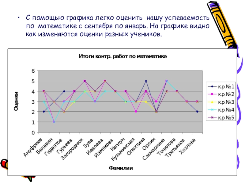 Слайд 12С помощью графика легко оценить нашу успеваемость по математике с сентября