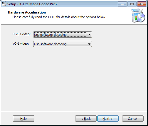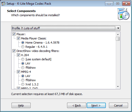 MPEG-2, DVD — как и в случае с H.264, при обнаружении установленных в системе таких кодеков (например DScaler5, Microsoft MPEG-2, Cyberlink MPEG-2, Purevideo, InterVideo MPEG-2 decoder) установщик покажет [use system default]. Я для себя так и сделал, предпочёл системный Microsoft MPEG-2.