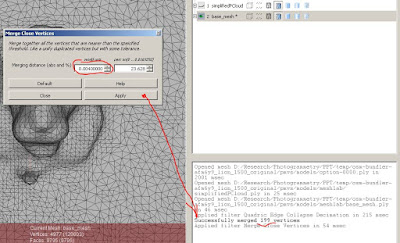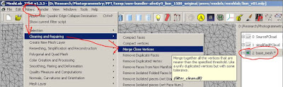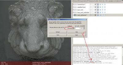 Но это ещё не всё.. Наша моделька сейчас слегка «тяжеловатая».. и её нужно немного подчистить — убрать лишние вершины(вертексы).. После применения трансфера атрибутов некоторые вершины оказались практически в одной точке.. и их правильнее объединить в одну. Это мы и сделаем.. Воспользуемся уже ранее применяемым фильтром «Merge Close Vertices» Но на этот раз нам нужно сохранить большую детализацию, по этому в поле вводим число не 0.004 как в первый раз, а 0.0002.