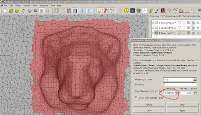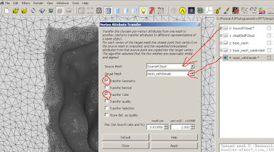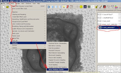 И в MeshLab для этого есть отличный инструмент — «Vertex Attribute Transfer». Если говорить очень упрощенно, то он позволяет скопировать значение позиции одной точки на другую.. таким образом мы сейчас с помощью облака точек, как-бы «выдавим» из нашей упрощенной «пластилиновой» поверхности все детальки.