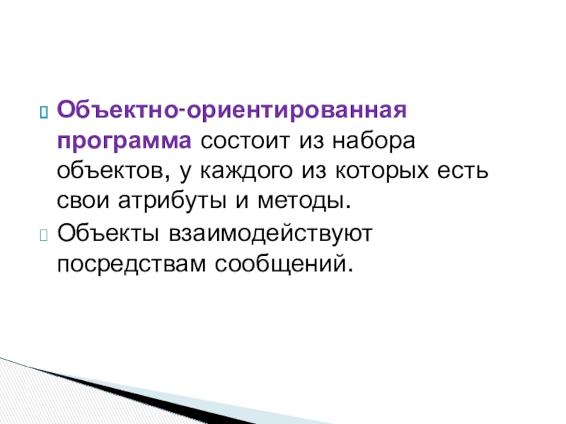 Слайд 19Объектно-ориентированная программа состоит из набора объектов, у каждого из которых есть