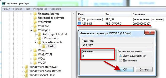 Закрываете редактор реестра, перезагружаете компьютер, теперь учётной записи ASP.NET вы больше не увидите! Если вдруг захотите вернуть её на место (сделать видимой), откройте ту же ветку реестра и измените значение на 1 или вовсе удалите созданные разделы.