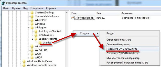 Если в ветке раздела Winlogon не существует раздел SpecialAccounts и подраздел Userlist, то их нужно создать! Кликайте по разделу Winlogon ПКМ и выбираете Создать -> Раздел, пишите: SpecialAccounts и жмёте на Enter. Затем точно также выделяете SpecialAccounts и создаёте раздел Userlist.