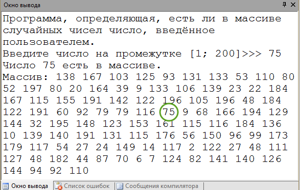 Запустим программу на выполнение. Введём число 75. Программа вывела сообщение о том, что такое число есть в массиве. Просмотрев элементы массива, мы можем убедиться, что такое число действительно в нём есть.