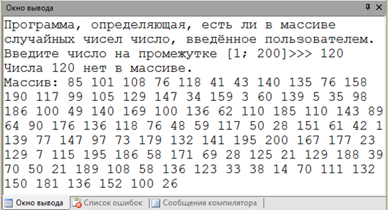 Снова запустим программу и введём число 120. Программа вывела сообщение о том, что такого числа нет в массиве. Программа работает правильно. Задача решена.