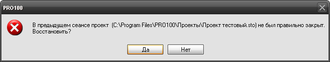 В программе PRO100 есть очень полезная функция — «Непрерывное сохранение для восстановления». Если неожиданно отключили свет или компьютер завис и отключать его прошлось принудительно, эта функция в программе PRO100 ПРОСТО не заменима. При следующем запуске программы и открывании экстренно закрытого проекта, появится такое окошко: