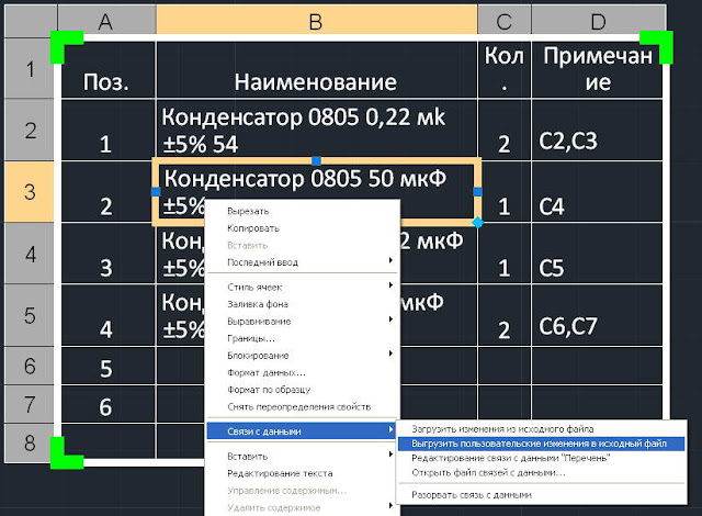 Если разблокировать содержимое или формат таблицы, то можно ее править в самом AutoCAD и в любой момент передать изменения в исходный Excel-файл. В уже известном нам меню Связь с данными есть соответствующие команды: