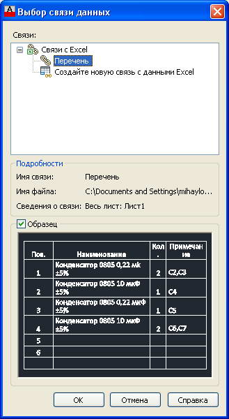 5. Теперь в окне Выбор связи данных выбираем нашу созданную связь и вставляем таблицу в чертеж