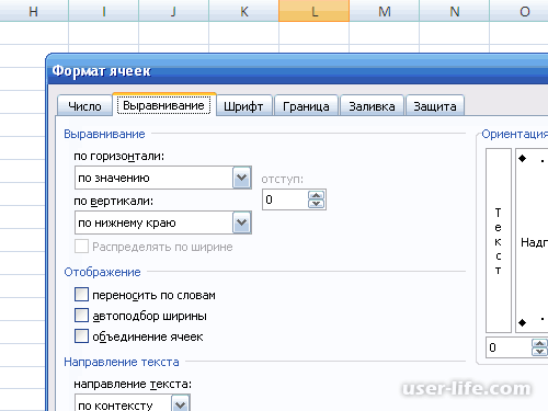 В этом же окне можно произвести выравнивание в ячейке, это делает вкладка «Выравнивание».
