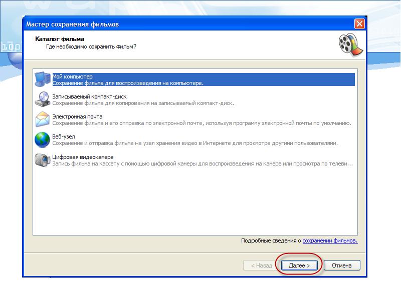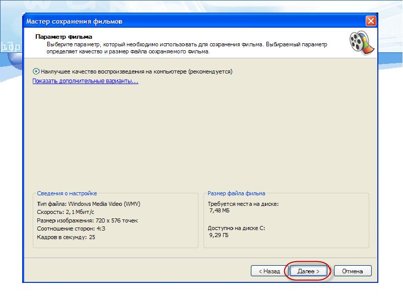 Завершающий этап работы в Windows Movie Maker — сохранение слайд-шоу, не имеет каких-либо особенностей. Выбираете нужный пункт в разделе Завершение создания фильма, и далее простой мастер сохранения фильма подскажет необходимые действия. Напомню, что сразу создать DVD-диск для просмотра на бытовом плеере удастся только в Windows Vista Ultimate или Home Premium. Если же вы пользуетесь Windows XP, то выбираете пункт Сохранение на компьютере и далее на странице мастера Параметры фильма устанавливаете Другие настройки — DV-AVI (PAL), и получите. заготовку для будущего DVD, которую надо сначала конвертировать в нужный формат, а потом записать на болванку. В общем, достаточно муторно.