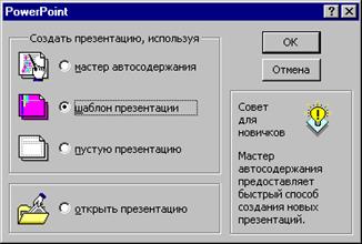 После запуска приложения на экран выводится стартовое диалоговое окно (рис.1), в котором предлагается либо создать новую презентацию, либо открыть уже существующую (подобный диалог появляется только при запуске программного продукта). В нем для создания новой презентации предлагаются три способа: мастер автосодержания; шаблон презентации; пустая презентация.