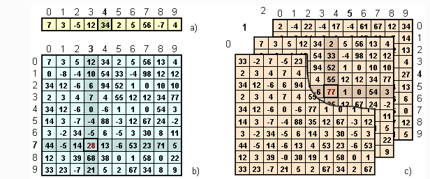 Рисунок 8 — Типы массивов( а-одномерный, b –двумерный, с-трёхмерный)