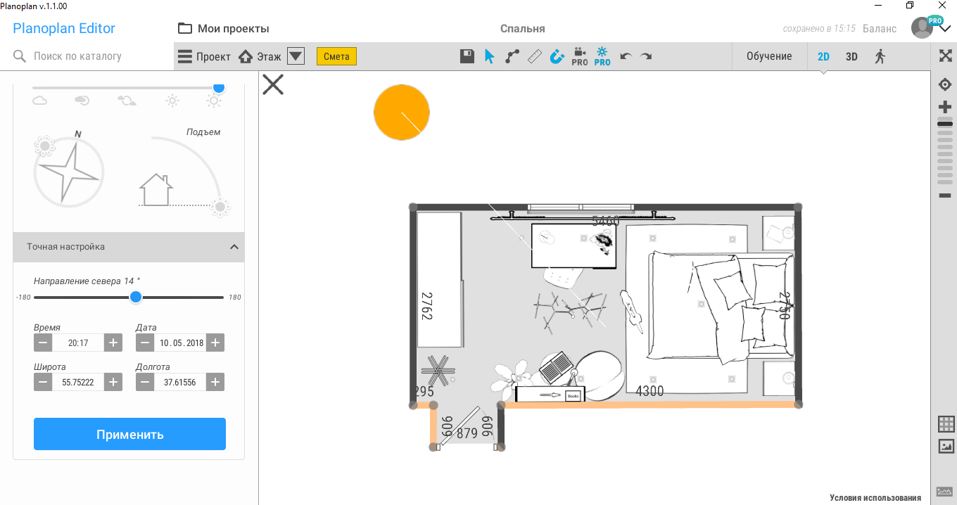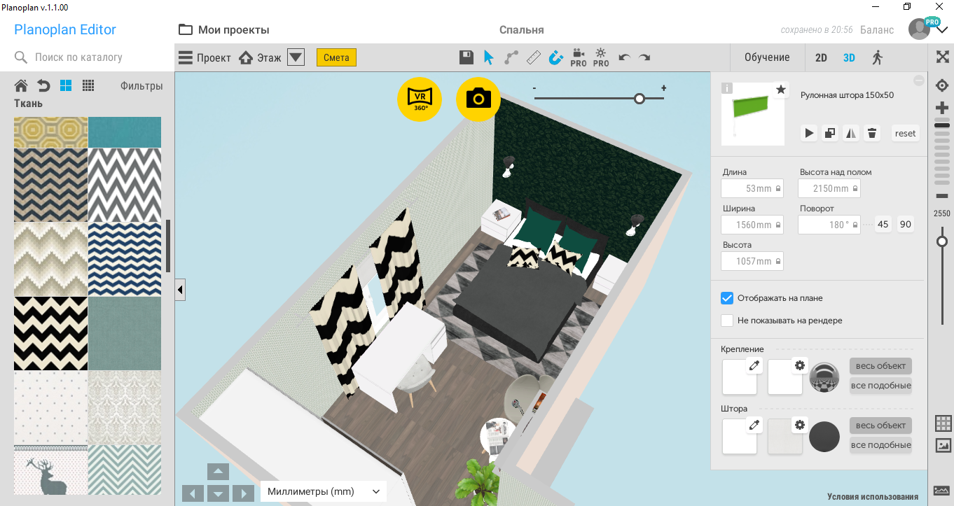 Если говорить о естественном освещении, то здесь тоже есть с чем «поиграть» в режиме PRO. Я выставляла разное время дня, меняла местоположение и яркость солнца, чтобы посмотреть, как комната будет смотреться при ярком дневном освещении и вечером с включенными лампами.