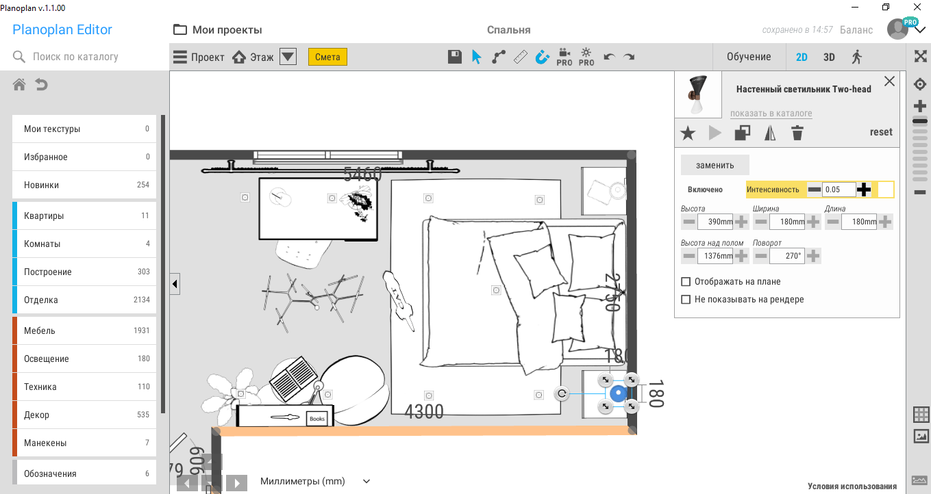 Теперь что касаемо программы. Любой источник света можно включить или выключить + вы самостоятельно регулируете его интенсивность в зависимости от нужного сценария освещения. Не помню ни одну онлайн-программу, где можно было бы такое провернуть)) Очень крутая опция! Еще есть возможность добавлять розетки/выключатели, они добавляют еще больше реалистичности финальной картинке.