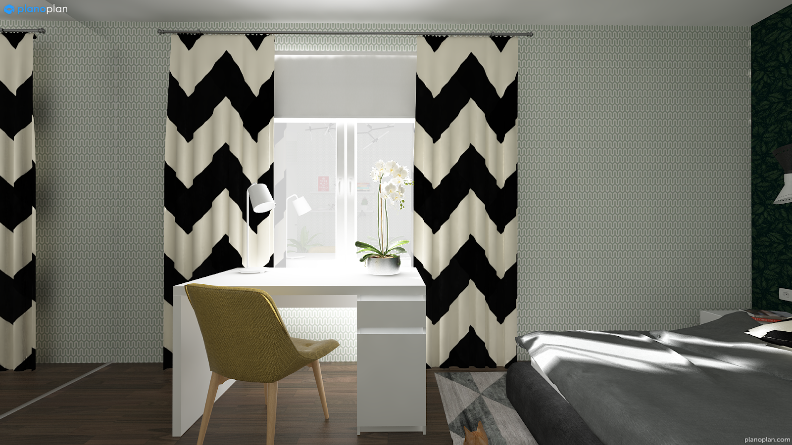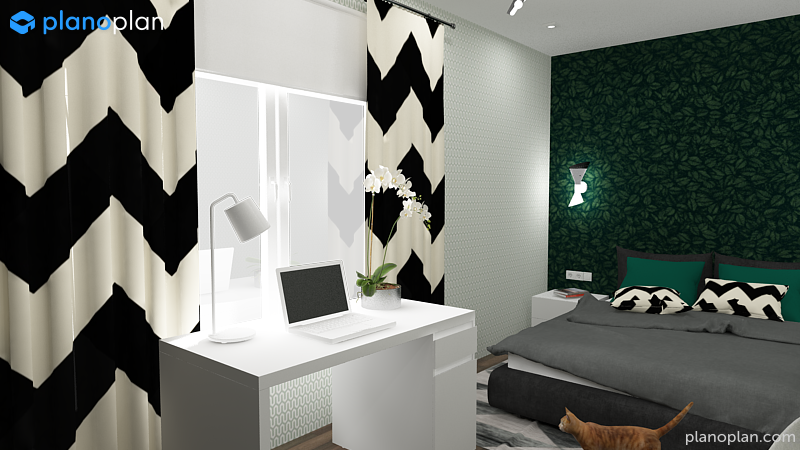 Этот этап уже напоминает игру SIMS, помните такую? Я её обожала! Накладываем текстуру пола, подбираем красивые обои или краску, меняем обивку мебели — и вуаля, интерьер сразу же преображается, превращаясь из серой коробки в уютное пространство. Я решила стену за кроватью сделать акцентной и оклеила ее обоями насыщенного изумрудного цвета, остальные стены сделала более нейтральными.