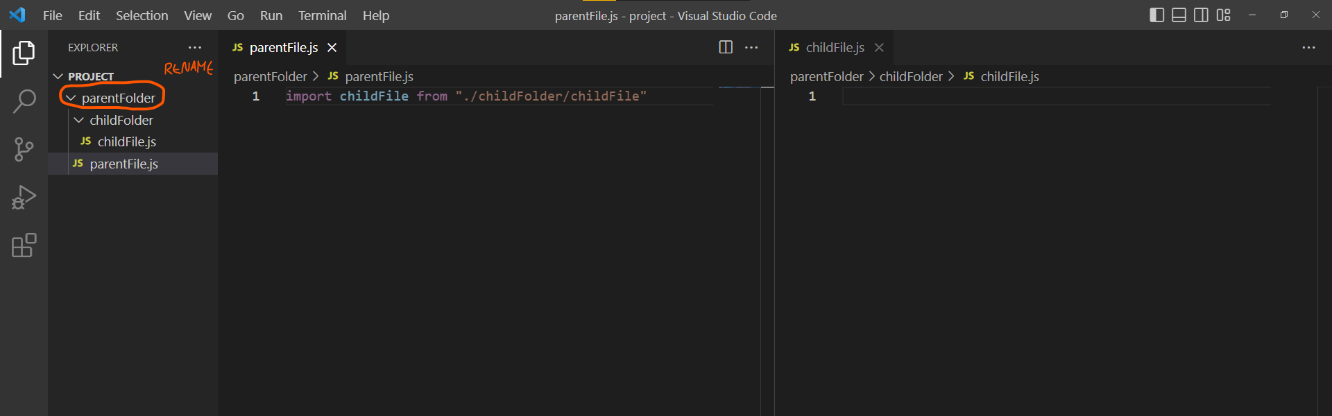 VS Code не может переименовывать папки в проектах JavaScript, если эта папка содержит файл с оператором «импорт», который импортирует файл из подпапки.
