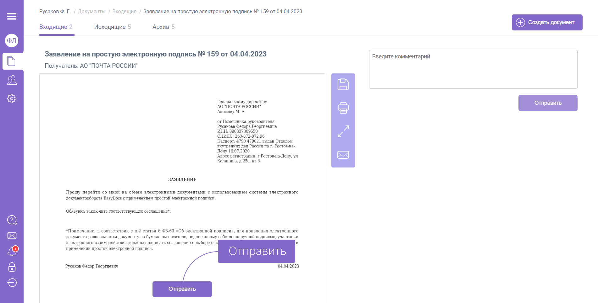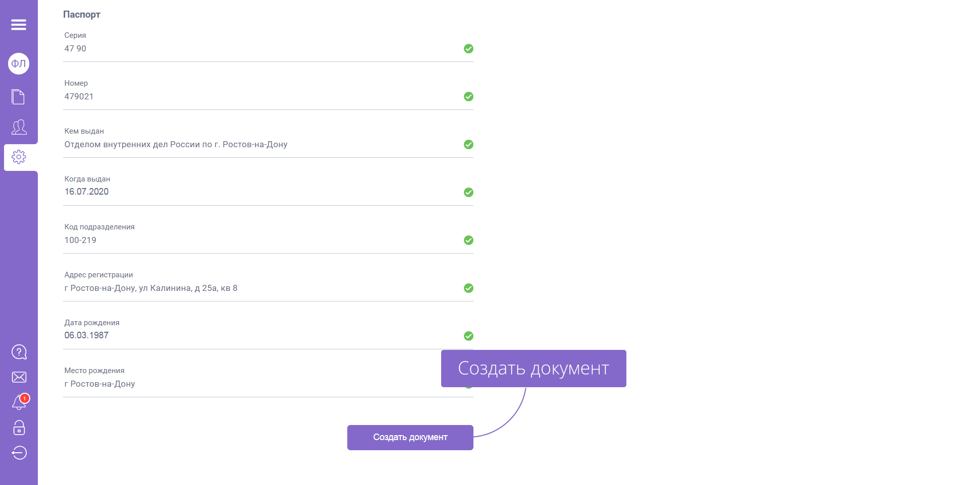 Проверьте корректность введенных данных и сформируйте заявление на выпуск простой электронной подписи «Создать документ».