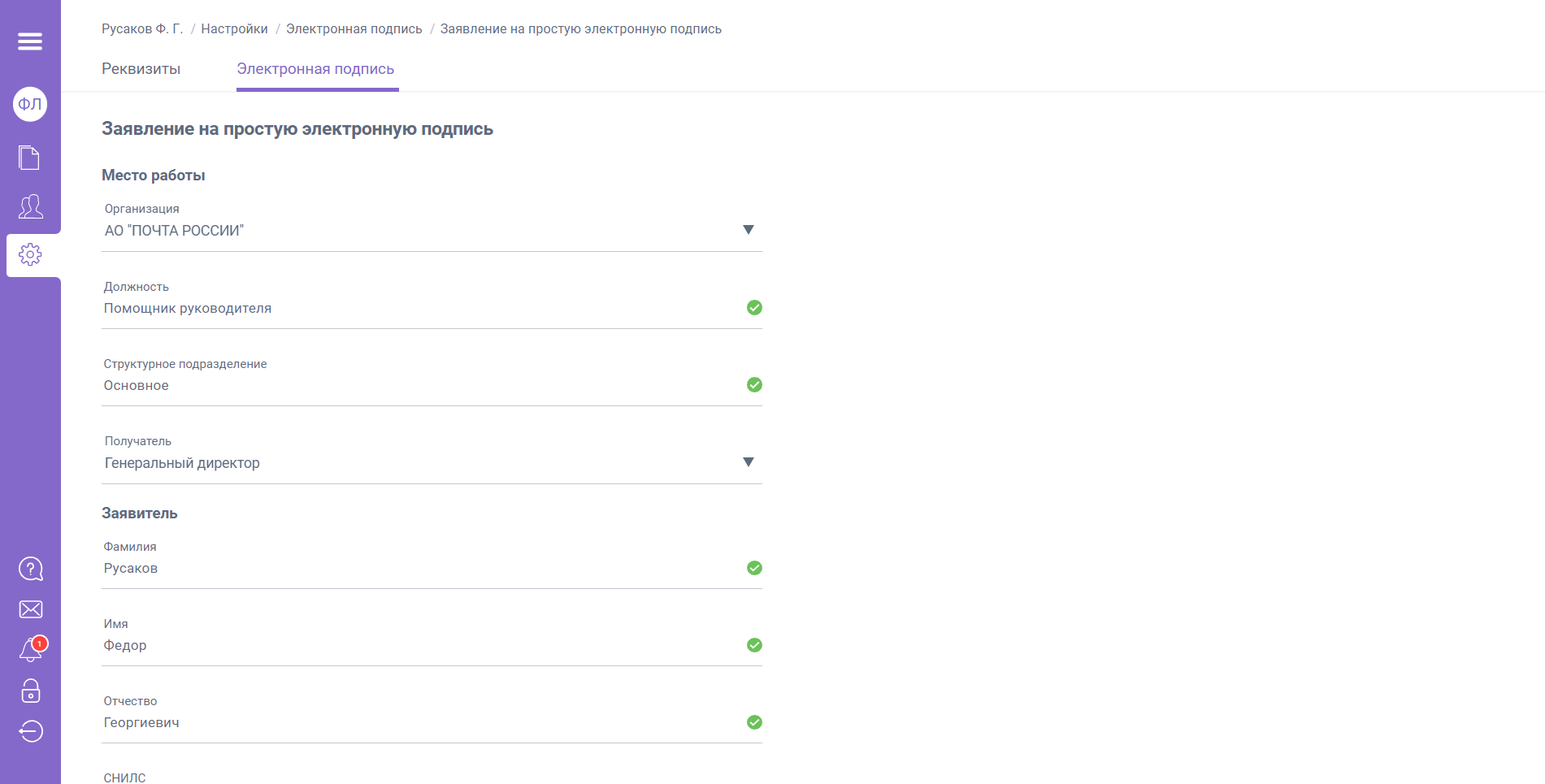 После того как работодатель подпишет Ваше заявление, ПЭП будет автоматически выпущена, в разделе «Настройки» / «Электронная подпись» появится строка с активным сертификатом.
